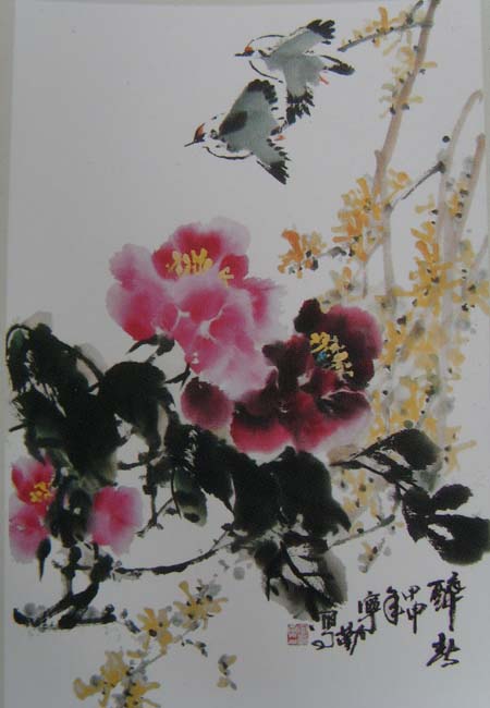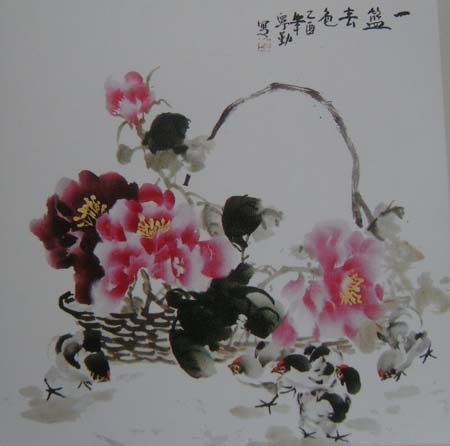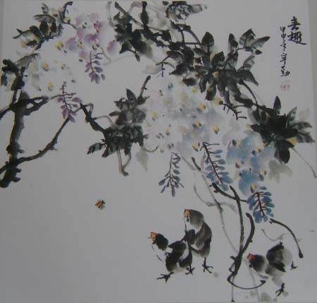其实,她的特色不仅仅是牡丹,只是牡丹娇艳富贵,很多人喜欢,索求的多了,她不推却,画得就多了。她画得最好的还是紫藤、蝴蝶兰、迎春花等,紫藤、蝴蝶兰、迎春花配以小鸡小鸟小虫,生机盎然、生动有趣。她思维敏捷,心灵手巧,一些很普通的花花草草在她笔下总是活灵活现。加之她的勤奋,一个创意要画无数遍,不断尝试,不断完善,熟能生巧,笔墨自然畅快淋漓。