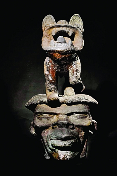 艺术家对于生活的周围环境,人和事总是有着与生俱来的敏感,比如说现代人生活的焦虑、浮躁感。他说,这种感觉笼罩着每个人,包裹着大众,无人幸免,大家都在困扰,都在希望能突破,希望有宣泄的途径。而这给了自己创作的灵感,尤其是给了他自身艺术风格打造的新的启发,并在近年来形成了一种“人、动物”(见图)搭配构成的雕塑作品特色。用他的话说,新创作的作品都有一种“格式”,即一个大大的人头和延伸的事物进行搭配,延伸的事物则以各种动物为主。比如说他的新作《远古的回声》,一个大大的人头,表情淡然,显出“冥思”状,而人头上的乌龟则开口长鸣,充满岁月感,“乌龟代表了岁月长远,而人的表情,则代表与远古的某种心灵契合,这恰恰是现代人在烦扰之余需要自我反省,找回自我的方式,是一种人生的体验和警示。”