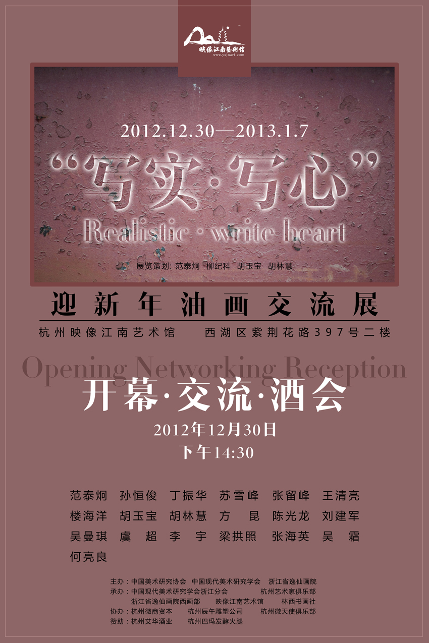 由杭州艺术家俱乐部、浙江省逸仙画院西画部、林西书画社共同发起的“写实·写心”映像江南迎新油画交流展,于2012年12月30日在杭州紫荆花路397号的杭州映像江南艺术馆开展,并于下午2:30举行展览交流会,本次展览不设大主题大思想,仅是在新年来临之际部分志同道合的艺术家相聚交流、展示近作、广交益友、除旧迎新的展览,更是一次青年艺术家向前辈艺术家求艺讨教、提高艺术水平的展览。展览时间到2013年1月15日结束。
