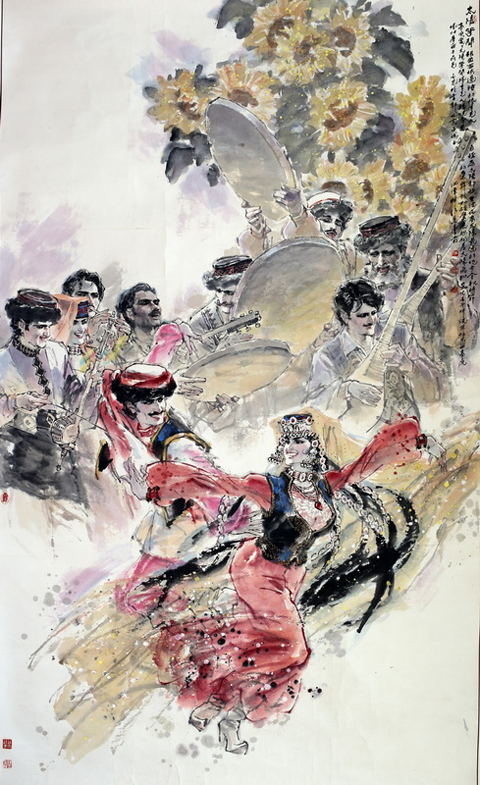 图为:水墨舞蹈画《太阳花开》陈玉先 2002年(236cmx142cm)