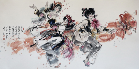图为:水墨舞蹈画《喜气洋洋》陈玉先 2000年(68cmx136cm)