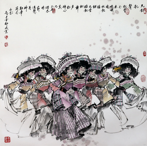 图为:水墨舞蹈画《天韵歌声(傈僳族)》陈玉先 2009年 68cmx68cm