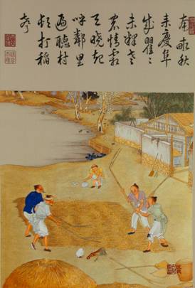 图为耕织图之持穗,康熙帝题词:南亩秋来庆阜成,瞿瞿未释老农情。霜天晓起呼邻里,遍听村邨打稻声