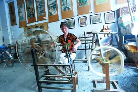 “这只是初级的阶段。”牟秉衡介绍,竹帘制作工艺有30多道工序,抽成丝后,还有提纵、织帘、绘画等流程,十分繁杂。记者看到,竹子抽成丝后被送到工人手里,工人用一台传统的木制织布机和蚕丝一起织成竹帘。