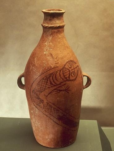 绘有有足蛇类图案的双耳细颈椭圆陶土罐,中国史前时期,公元前3000年。