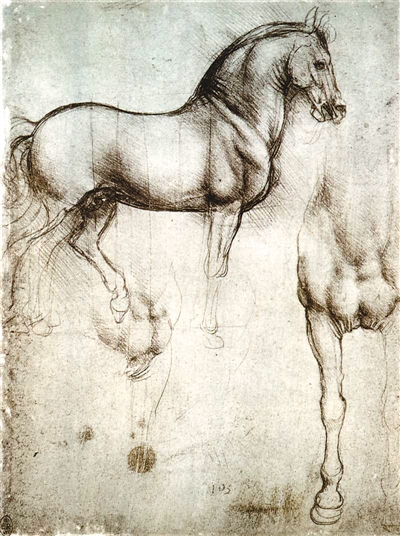 中世纪以神学为主导,这一时期的西方艺术更倾向于表现上帝的庄严和神性,而非客观世界的丰富多彩。马是中世纪骑士的忠实伙伴,却很少成为艺术家表现对象。文艺复兴时期,人从神学的桎梏中解放出来,艺术家开始注重观察和研究自然,代表是达·芬奇。为了给米兰大公卢多维科·斯福尔扎创作纪念其先祖的大型骑马雕像,达·芬奇认真研究马的动态和解剖结构。可惜他仅完成了马的模型,而且终毁于入侵米兰的法国士兵之手。但是,达·芬奇留下了大量表现马动态和结构的素描,让我们得以领略其艺术风采。