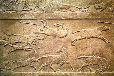 猎杀野马,公元前九世纪亚述王宫石灰石浮雕,大英博物馆藏