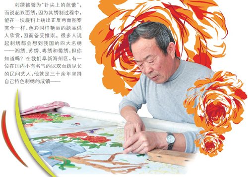 刺绣被誉为“针尖上的芭蕾”,而说起双面绣,因为其绣制过程中,能在一块底料上绣出正反两面图案完全一样、色彩同样艳丽的绣品供人欣赏,因而备受推崇。很多人说起刺绣都会想到我国的四大名绣——湘绣、苏绣、粤绣和蜀绣,但你知道吗?在我们阜新海州区,有一位在国内小有名气的以双面绣见长的民间艺人,他是三十余年坚持自己特色刺绣的成镇——说起刺绣,人们记忆里的印象都是女红,我市非物质文化遗产项目——蒙古勒津刺绣的传承人也多以女性为主。针线活儿这东西本身不是粗犷的男性所能简单掌控的,但是成镇老先生却凭借自己的毅力和钻劲儿,在刺绣的世界里开辟出一片不一样的天空。