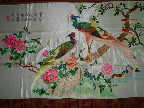 也称川绣即以四川成都为中心的刺绣品总称,与蜀锦一起被称为蜀中之宝。蜀绣具有悠久的历史,当时的生产品种主要是官服、礼品、日用花衣、边花、嫁奁、彩帐和条屏等,其绣刺技法甚为独特,至少有100种以上精巧的针法绣技,如五彩缤纷的衣锦纹满绣、绣画合一的线条绣、精巧细腻的双面绣和晕针、纱针、点针、复盖针等都是十分独特而精湛的技法。当今绣品中,既有巨幅条屏,也有袖珍小件;既有高精欣赏名品,也有普通日用消费品。比如北京人民大会堂四川厅的巨幅芙蓉鲤鱼座屏和蜀绣名品蜀宫乐女演乐图挂屏、双面异色的水草鲤鱼座屏、大小熊猫座屏,是蜀绣中的代表作。