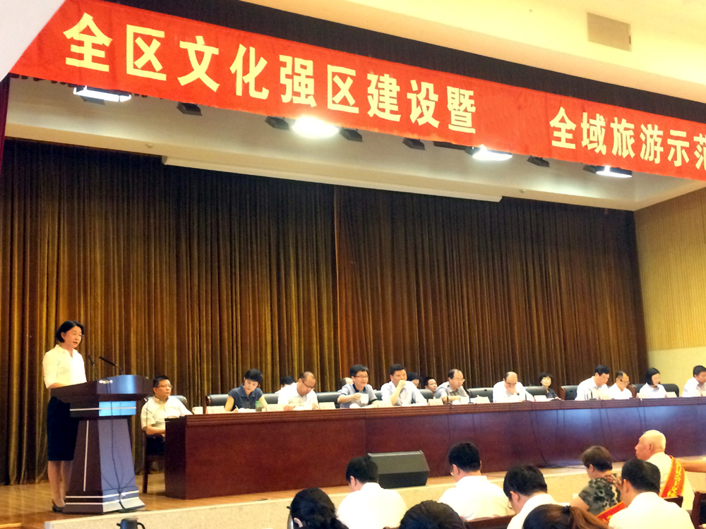 区委副书记、区长秦咏薪做了文化强区和创建全域旅游示范区的工作部署的讲话。秦区长说梁溪区是历史悠久、人文荟萃之地,是得景独秀、山水俱佳之地,是传承延续、古今辉映之地。这些条件是文化强区的根基所在,全区文化自信底气所在。秦区长从文化和旅游方面谈了梁溪区下阶段各项工作重点。在文化建设上将着力弘扬社会主义核心价值观,着力加强历史文化遗产传承和保护,着力构建现代公共文化服务体系,着力推进文化产业提质增效发展等。秦区长强调文化产业是区域软实力的象征,是稳增长、调结构、促转型、惠民生的重要着力点,要坚持把文化产业作为先导性、战略性、支柱性产业来培育,争取在“十三五”末期,梁溪区文化产业增长值占GDP比重达到5.3%左右。梁溪区在根据资源禀赋和空间结构,着力打造“一带、三区、四园”。推动以北仓门等四家成为文创、设计等产业为主的具有一定影响力的行业领军型创意园区。