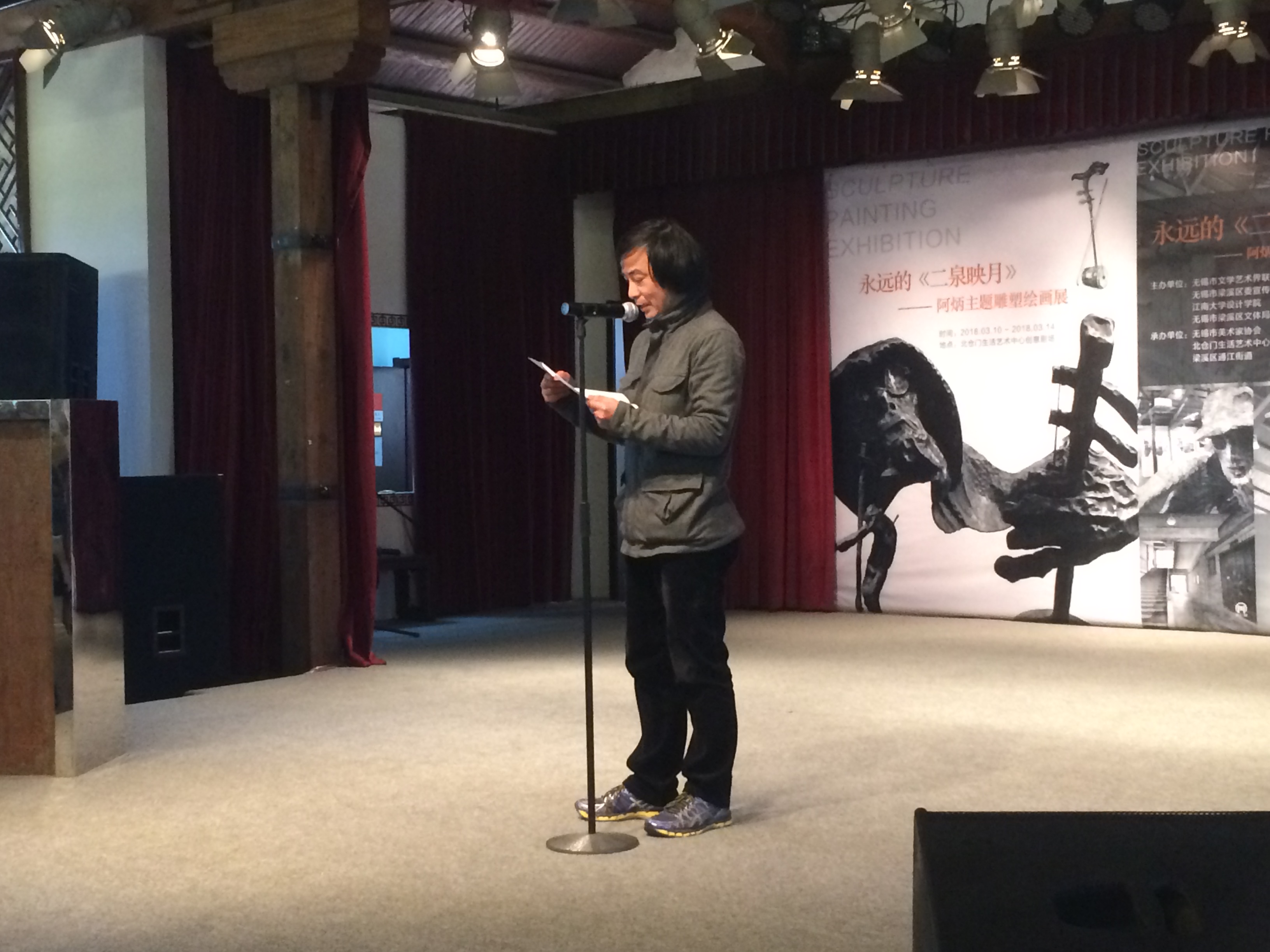 徐诚一教授在致辞中表示,在无锡建设文化强市的新时代,艺术家应该不忘从艺初心,牢记文化使命,以新气象、新作为创作出艺术家所在新时代应有的作品,为无锡文化艺术繁荣做出贡献。他说,坚定文化自信,讲好无锡故事,可以滋养一个人的性情,也催生了人们对生活、生命的深刻思考。这次展示的200多件阿炳雕塑绘画作品,是老师和学生力图追求作品的形神兼备,从构思,到成形,都是很好的与阿炳对话,表达出创作者的艺术心智和真挚情感。在政府,高校,园区,艺术家的共同努力下,定能开创无锡雕塑和阿炳文化发展繁荣的新局面。