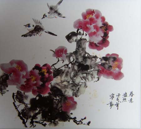 其实,她的特色不仅仅是牡丹,只是牡丹娇艳富贵,很多人喜欢,索求的多了,她不推却,画得就多了。她画得最好的还是紫藤、蝴蝶兰、迎春花等,紫藤、蝴蝶兰、迎春花配以小鸡小鸟小虫,生机盎然、生动有趣。她思维敏捷,心灵手巧,一些很普通的花花草草在她笔下总是活灵活现。加之她的勤奋,一个创意要画无数遍,不断尝试,不断完善,熟能生巧,笔墨自然畅快淋漓。
