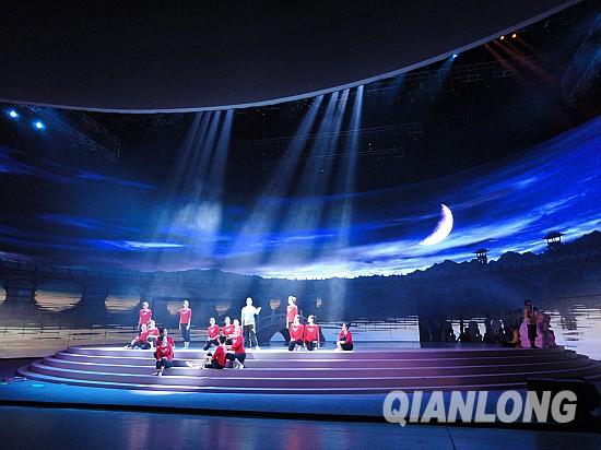 昨晚,走进体育馆,记者看到的是一块子上写着的醒目大字:“2012大型情景音舞诗画《天安门》距2012年5月16日开幕9天”。此时的体育馆内搭建成气势恢宏的巨大圆形舞台,舞台中间双向时空转盘,多层360度旋转为演员提供了灵活的表演空间,空中特殊装置让演员从天而降。宽60米、高20米的180度环型LED大屏幕,具有强烈的视觉冲击力。在LED屏上有一个出人意料的长达11米的旋转摇臂随时出现。此外,LED屏还隐藏着几处伸缩台阶,可以随时伸展。一架A380空中客车“降落”在体育馆舞台上时,在LED屏上竟神奇地出现了悬梯,有真人从LED屏中走出,让记者惊叹不已。