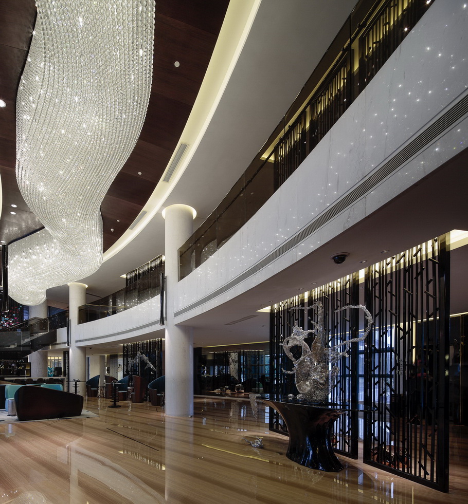 大面积水晶吊顶如一条涓涓不息的长河,源远流长,营造了精品奢华及山水写意、如梦如幻的美感;