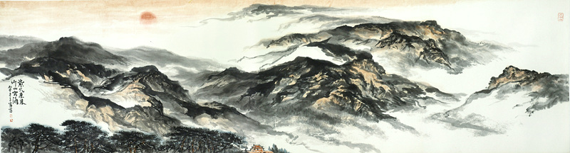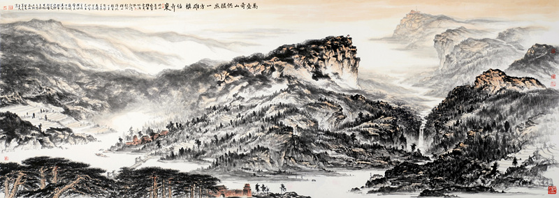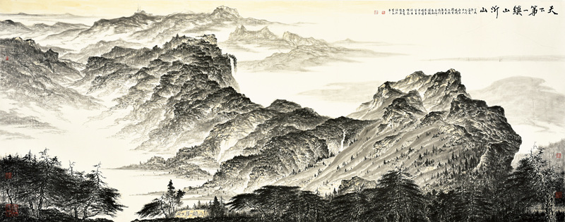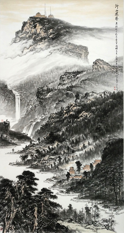 在这些艺术家中,韩子富先生是实力为执着的一位。2007年他从山水画大师贾又福工作室学成后,先是跃马太行,创作出《伟哉太行》系列,继而转战沂山,并终把艺术目光锁定在这座家乡高峰,成为潍坊人画潍坊山水的倡导者和力行者。一幅幅《大美沂山》系列巨作,挥洒而出,给我们带来阵阵惊喜。其中精心创作的山水画六尺巨作《沂山揽胜》2013年4月入选在北京中国军事博物馆举行的中国画学会《届全国中国画学会学术展》,成为我市艺术界的一件大事。这次为庆祝沂山荣获5A级旅游景区,举办的《东镇雄风——韩子夫大美沂山写生创作展》,荟萃了60多幅水墨山水精品佳作。