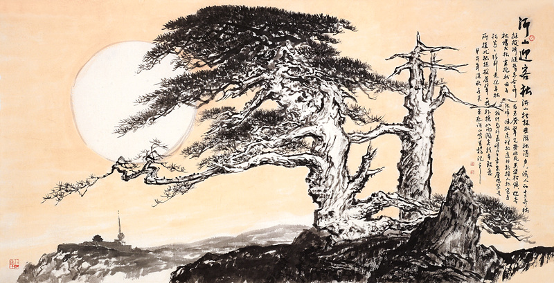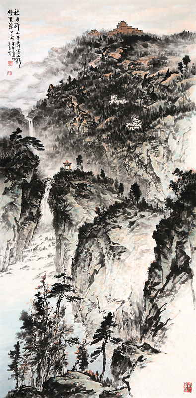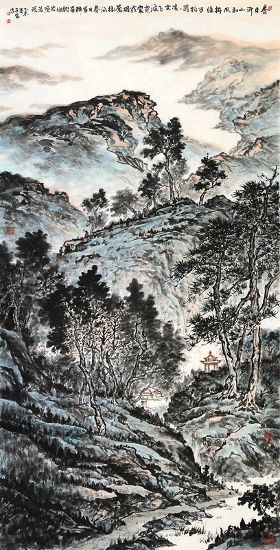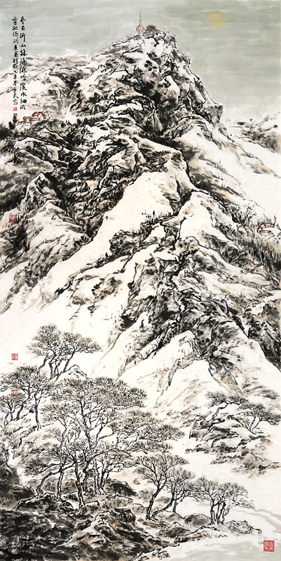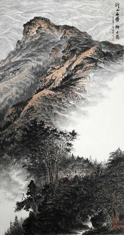 韩子富的创作重视以古人为师和师法自然。他深有感触地说:“以古人为师,以大自然为师,乃吾终生之道也。”他尊重传统,不断从古代名家中汲取营养。他下大力气临过石 、文徵明,王时敏,范宽,龚贤、王蒙、王原祁等古代画家的作品和近人黄宾虹,黄秋园等大家的作品。韩子夫在临贴中都反复揣摩,取人之长为己之长,特别是从石 身上,韩子夫学到大量东西,打下扎实的传统笔墨功底。古代名家那些峻拔雄阔、壮丽浩莽的气魄,浑厚清逸、朴拙苍润的笔触,沉着稳重的画风,一一汇聚在他的笔下。他外师造化,中得心源,搜尽奇峰打草稿。他多次“裹糇粮、游太行”。近三四年,他数上沂山,观察、体验、感悟、写生。他在这里近观远望,仰视俯瞰,以奇石古松为伴,与飞鸟山花交友,用长期从事新闻工作的纪实观察力和职业画家的敏锐艺术观察力,发现沂山之美。他是一位真正读懂沂山,体察沂山之魂的画家。在以古人为师和师法自然基础上,韩子夫的创作力求融入时代气息和自己的与审美情趣。他画的《沂山玉皇顶》、《歪头崮》、《百丈崖瀑布》、《东镇庙》、《玉枝台夫妻松》、《沂山晚翠》都是对真实景物进行艺术的提炼和概括,赋予自己的胸襟和理解,形神兼备,韵趣天成,具有很强的艺术感染力。让人们在领略山水之美的同时,感受到崇高、昂扬、向上的精神和力量。他擅作大画,立意高远,布局开阔,浓墨重彩,淋漓酣畅。他把在长城岭上西眺看到的沂山全景纳入笔下,挥写成巨幅杰作,让我们看到了绵延起伏,林壑纵横,逶迤盘旋的大美沂山。气势磅礴,浩气恢弘。一组写生小品,也是“咫尺之图,写百千里之景”,呈现大气雄浑的画风。