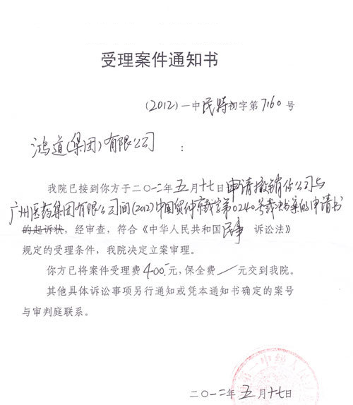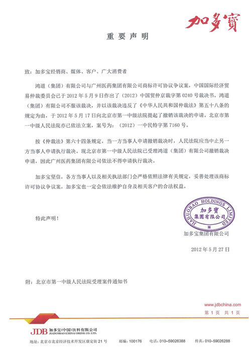 加多宝昨天发布声明表示,对于中国国际经济贸易仲裁委员会下达的(2012)中国贸仲京裁字第0240号裁决书,鸿道(集团)有限公司不服该裁决,并以该裁决违反了《中华人民共和国仲裁法》第五十八条的规定为由,于2012年5月17日向北京市中级人民法院提起了撤销该裁决的申请,法院亦已依法立案。