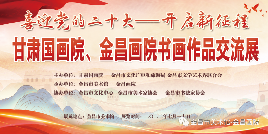 ……引导广大文艺工作者不忘初心、牢记使命,坚持“深入生活 扎根人民”,努力创作描绘新时代、反映新生活,展现新风貌的优秀作品。进一步推动艺术交流和发展,由甘肃国画院、 金昌市文化广电和旅游局、 金昌市文学艺术界联合会主办,金昌市美术馆(金昌画院)承办,金昌市文化中心、 金昌市美术家协会、金昌市书法家协会协办“喜迎党的二十大 开启新征程——甘肃国画院、金昌画院书画作品交流展”。