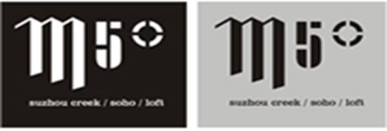 M50品牌图标:标志由厂房、油漆字、工业零件等符号提炼出不同形态的M,5,0三个字符,并组合出极富现代感的字体标志M50。标志下方的suzhou creek/soho/loft很好的诠释了M50的紧靠苏州河的地理位置和仓库式的存在形式,体现了M50是历史、文化、艺术、时尚与创意的融合。