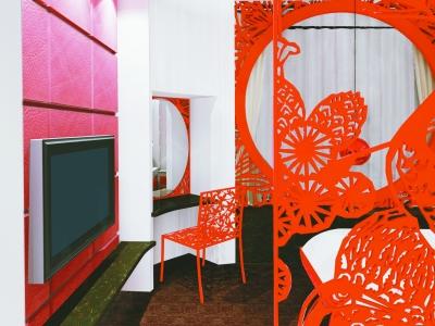 南京师范大学美术学院学生王冬雅设计的“南京剪纸主题客房”,在此次比赛中摘下了一等奖。在她的设计方案中,整个客房遵循南京剪纸“红纹白底”的色彩样式,以红白两色作为主色调,考虑到色调会有些轻浮,她选用了黑色大理石作为台面,增强整体色调的稳重感。而隔断、背景墙、椅子等配套环节,则融入了南京剪纸“花中有花、题中有题、粗中有细、拙中见灵”的艺术风格特点,连推拉门、窗框及镜框等细部装饰,也处处彰显出剪纸的独特韵味。“这个设计方案的空间主题非常鲜明,每一个节点都营造出浓厚的剪纸氛围,让客人一进门能感受到独特的南京民俗风韵。”市工艺美术总公司副总经理裘小洵对记者点评道。