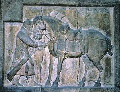 唐代,中国骏马雕塑品达到艺术造型的新高峰。唐太宗李世民昭陵前的“昭陵六骏”,是他在建立唐朝前先后骑乘过的六匹战马拳毛騧、什伐赤、白蹄乌、特勒骠、青骓和飒露紫的巨幅浮雕像,呈现出一往无前的雄浑气势,开唐代骏马雕塑的时代新风。六块矩形浮雕,每块雕出一匹正侧视的战马,或行走,或奔驰,姿态各异,形貌写实。六骏中,仅飒露紫雕作是中箭受伤后伫立的姿态,前面雕有将军丘行恭,正在为它拔箭,表现着征讨王世充时会战邙山时的情景。用以纪念和颂扬唐太宗李世民的丰功伟绩的“昭陵六骏”,是一组成功的纪念性或纪功性的石雕作品。与西方纪念雕塑作品不同,英雄本人的形象并没有出现,但是从他所骑乘的战马的雄姿,人们时时都感到英雄的存在,这也正是东方艺术强调含蓄和象征手法的成功杰作,毫无夸张及霸气之感。也可以认为这是承袭西汉霍去病墓冢石雕的传统,以战马雄姿象征英雄伟业。“昭陵六骏”还带给人们另外一个信息,是从十六国至北朝时期盛行的鲜卑系统的马具,这时已为突厥系统的马具所取代,这与李渊、李世民父子在晋阳仿效突厥组建骑兵,并大量由突厥输入骏马有关。