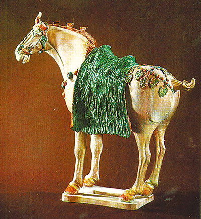 盛唐时期,描绘骏马的造型艺术同样走向繁荣。绘画方面,许多名家精于画马,仅在杜甫的诗作中,可以读到《丹青引赠曹将军霸》等吟咏马画的诗篇。雕塑方面,以目前所见令人赞赏的是随葬的三彩作品。从神龙二年(706年)葬的懿德太子李重润墓中出土的三彩俑群中,已可见三彩马的风采。它头部微侧,轮廓线流利活泼,鬃剪三花,鞍披鄣泥,张口作嘶鸣状。美中不足的是,马的体态塑制得过于圆腴,使人观后有“画肉不画骨”之感。比其迟约17年的右领军卫大将军鲜于庭诲墓中出土的三彩马,更为雄劲神骏,那刚劲有力的躯体轮廓内,显现出锋棱多力的马骨,更有怒马如龙之感。