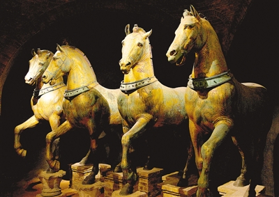 在此后的西方艺术中,马很少被如此残忍地对待,它们成了人类亲密的伙伴。希腊神话里,出现了很多与马有关的神祇,如额头长着长角的独角兽、长有双翼的飞马珀伽索斯以及半人半马的堪陀儿,马有了神性象征。雅典卫城中巴特农神庙的中楣浮雕饰带表现了古希腊“泛雅典娜节”的游行场面,欢腾的战马突出了节日气氛。威尼斯的圣马可大教堂立面的平台上有四匹青铜战马,原本是希腊古典时期的作品,一直陈列在君士坦丁堡的竞技场中,应该是为纪念马拉战车比赛的胜利而铸造的。1204年,威尼斯人借第四次十字军东征之机洗劫了君士坦丁堡,将这四匹战马运回威尼斯并安放在圣马可大教堂。1797年,拿破仑将它们掠往巴黎,直到1815年才归还给威尼斯。如此命运多舛,正说明它们有着迷人的魅力,才会引来这么多人垂涎。