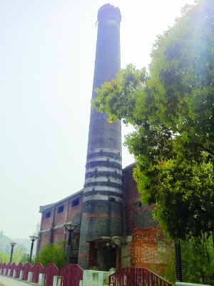 4月17日上午,记者在西水东地区看到,在西水关桥南侧有一间空闲的老厂房,厂房西北面竖着一只高30多米的烟囱,烟囱看上去已十分陈旧,老厂房已被一片幕墙围挡,保护了起来。另一根老烟囱已经得到了保护与修复,在夜间霓虹灯的照耀下,这根老烟囱显得十分漂亮。