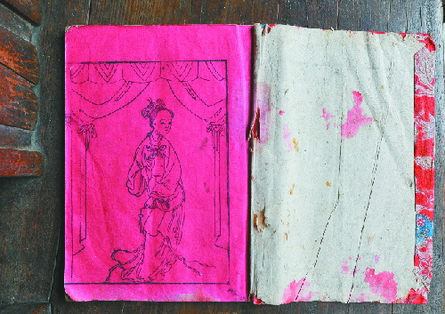 这本古书的封面用红色印花布包装,从纸张以及书的保存情况,张春前判断是一本清朝时期的书。“你看,开头的前两页是红色的,像我们现在书的扉页一样。”书的页画有美丽的女子,再加上书中的内容,张春前判断这是一本给女子用的书。书中的图案包括了花鸟虫鱼,还有一些人物,有的根据图形可以判断出是绣在鞋子、衣带上的,其他图案则更多是用于枕头、被面上。
