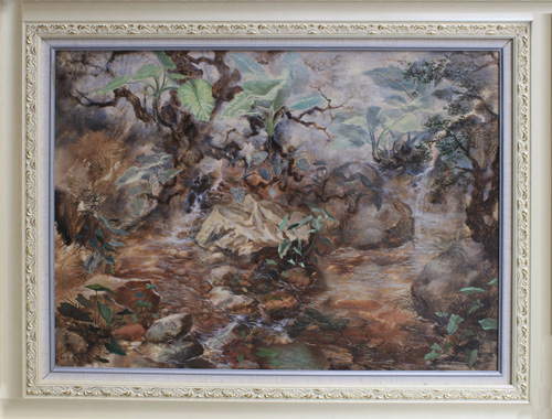 在谈到意象写实风格和佛家道家思想在画作上的具体表现的时候,方宋先生给我们讲解了他非常满意的作品《有榕图》。这幅图主要是通过榕树的刻画来表达中心思想的。“你仔细看这幅图,会发现这棵榕树历经沧桑而巍峨不动,非常有气势。而且它的根是长在流动的水潭里的一块土当中的,可以看出它的生命力是非常的顽强。所以当你做到能包容万物的时候它才能容下你。既能容树又能容大体。它斑驳的树根、繁茂的枝叶,展示了其旺盛的生命力。整个画面看似很复杂,但其实是很简单的,是水、石头和树。世间万物其实也是很简单的,像这幅图一样,很简单的组合,但看起来什么都有了,旺盛的生命力、岁月斑驳的痕迹、包容天下的胸怀等等,很完美。”