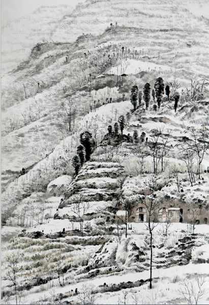 众所周知,用中国传统技法画雪景是有局限的,然而祁自强在长期的创作中,把传统国画与西方绘画相结合,既有泼墨信笔的洒脱,也有丝丝入扣、纤毫毕现的笔触,通过浓淡相宜、疏密有致的笔触,把雪的“白”从黄土、苍松中“逼”将出来,令人拍案叫绝。