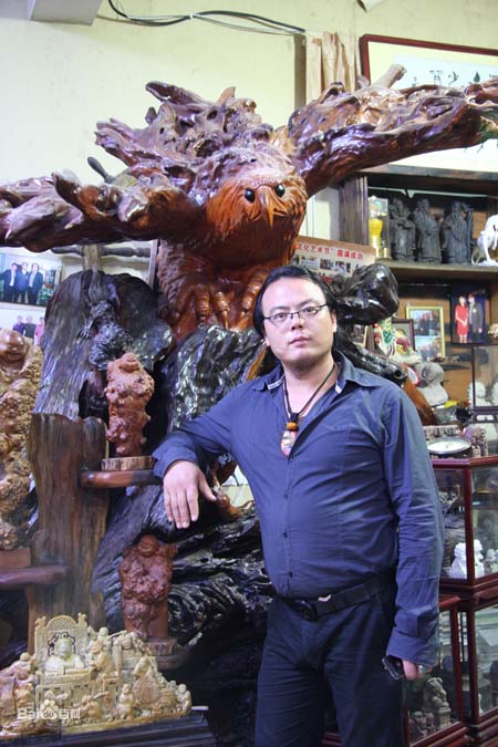 在“雄鹰”的旁边,还立着一尊看上去颇为沧桑的雕像,简洁的刀法在树干上勾勒出一位年轻女子的面庞。孙吉志告诉记者,这是他喜爱的龙眼木雕《昭君出塞》,曾在“首届闽台(集美)收藏文化艺术节”中特别展出。而这尊木雕的故事则更有些机缘巧合。2008年,孙吉志在集美偶然遇到了莆田雕刻大师田国珍。当时他因长期从事玉石雕刻引发身体不适,转行做起了木雕。求贤若渴的孙吉志力邀田国珍来到自己麾下,任命他为古船木加工厂厂长,并尽可能给他充分的创作空间。这件《昭君出塞》便是他为孙吉志创作的件作品。